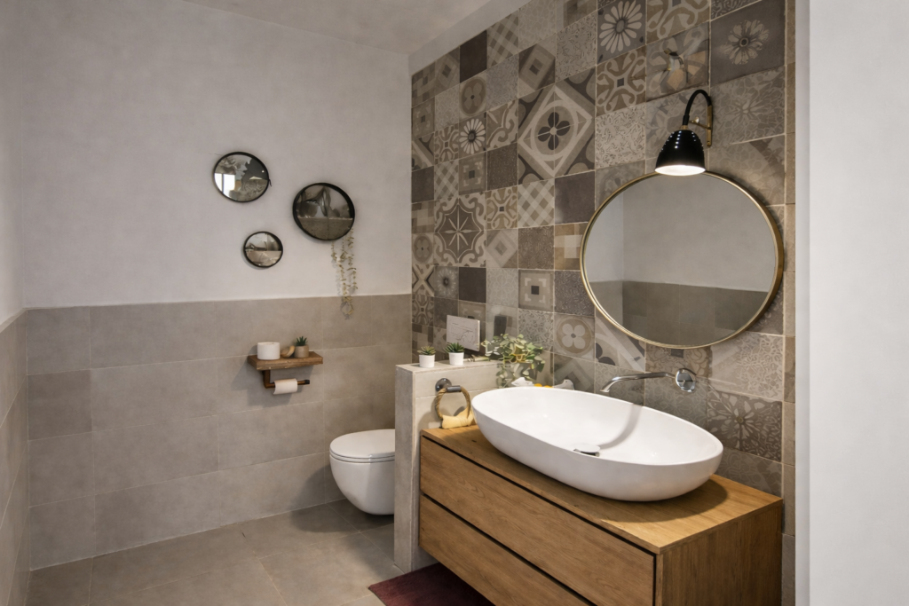 Il bagno di servizio al piano terra è caratterizzato dall’utilizzo di cementine decorative, elemento che conferisce personalità e richiama un’estetica senza tempo, reinterpretata in chiave contemporanea.tterizzato dall’uso delle cementine decorative, elemento che conferisce personalità e richiama un’estetica senza tempo.